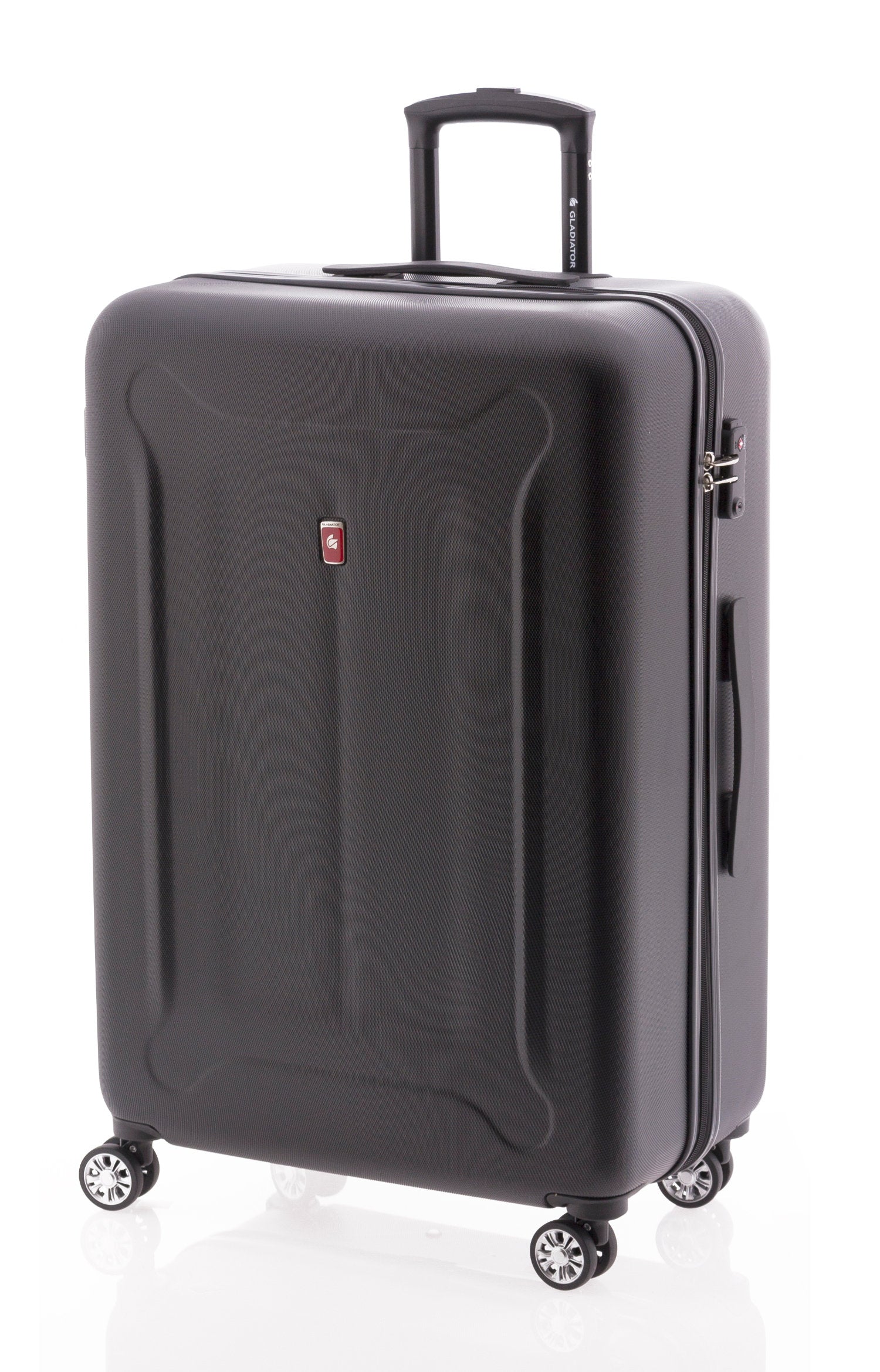 Maleta grande de máxima capacidad (95L) con estructura de ABS. Características clave: cuatro ruedas dobles giratorias, interior forrado con bolsillo y gomas de sujeción, y candado TSA de combinación lateral para mayor seguridad. GLADIATOR es el fabricante de esta maleta.